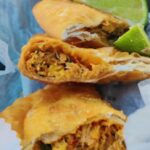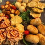 spring mix, purple onions, cucumber, radish with a fan avocado topped with hummus and house chips